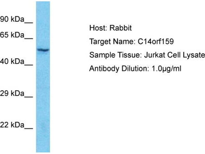 This is a rabbit polyclonal antibody against C14orf159. It was validated on Western Blot.