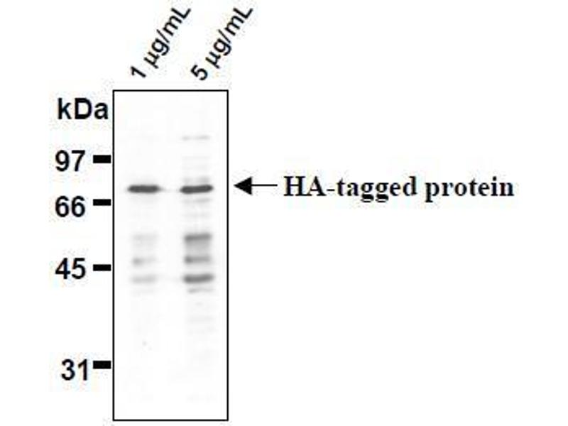 Epitope tagging has widely been accepted technique that fuse an epitope peptide to a certain protein as a marker for gene expression. With this technique, the gene expression can be easily monitored on western blotting, immunoprecipitation and immunofluorescence utilizing with an antibody that recognizes such an epitope. Amino acid sequences that are widely used for the epitope tagging are as follow, YPYDVPDYA (HA-Tag), EQKLISEEDL (Myc-Tag) and YTDIEMNRLGK (VSV-G-Tag), which corresponding to the partial peptide of Influenza hemagglutinin protein, Human c-myc gene product and Vesicular stomatitis virus glycoprotein respectively.Synonyms: HA Tag, HA-Tag, Hemagglutinin Tag