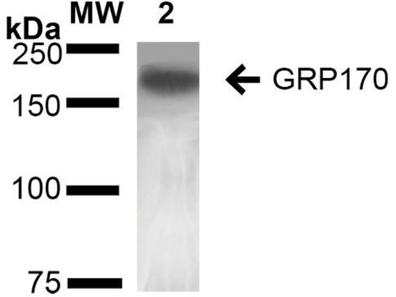 1 μg/ml of ABIN2868643 was sufficient for detection of GRP170 in 20 μg of HEK293 lysate by colorimetric immunoblot analysis using Goat anti-mouse IgG:HRP as the secondary antibody.