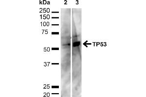 A 1:1000 dilution of ABIN2869023 was sufficient for detection of p53 on HeLa cell lysates using Goat anti-rabbit IgG:HRP as the secondary antibody.