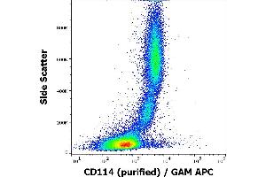 Colony stimulating factor 3 receptor,CD114 / G-CSFR (granulocyte colony-stimulating factor receptor, also known as CSF3R) is a type I transmembrane glycoprotein which upon binding of its ligand (G-CSF, granulocyte colony-stimulating factor) homodimerizes and activates signaling transduction to mediate cell proliferation, survival, and differentiation. It is expressed by granulocytes at all stages of their differentiation, as well as by monocytes, dendritic cells, and mature platelets. Among non-hematopoietic cells, it is expressed e.g. by endothelial cells, placenta, trophoblasts, and many tumor cell lines. This antigen is a target for stem cell mobilization for blood stem cell transplantation, for enhancing recovery of myelopoiesis following chemotherapy and in the treatment of patients with severe chronic neutropenia.,GCSFR, CSF3R, SCN7