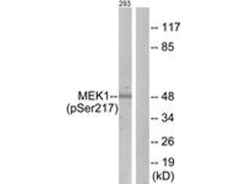 - MEK1/2 (Phospho-Ser217) Antibody detects endogenous levels of MEK1/2 only when phosphorylated at serine217.