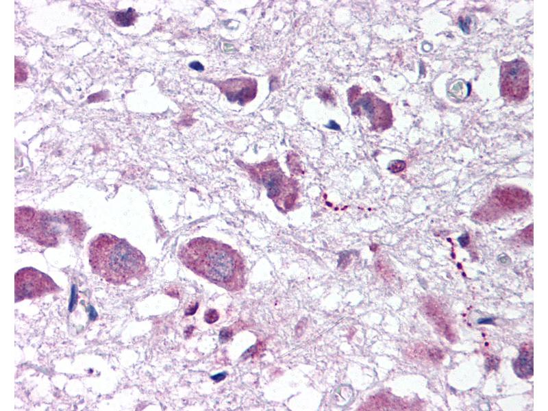 Usage: Immunohistochemistry: This antibody was validated for use in immunohistochemistry on a panel of 21 formalin-fixed, paraffin-embedded (FFPE) human tissues after heat induced antigen retrieval in pH 6.0 citrate buffer. After incubation with the primary antibody, slides were incubated with biotinylated secondary antibody, followed by alkaline phosphatase-streptavidin and chromogen. The stained slides were evaluated by a pathologist to confirm staining specificity. The optimal working concentration for this antibody was determined to be 10 mg/mL. Histology Positive Control Tissue: Hypothalamus. -