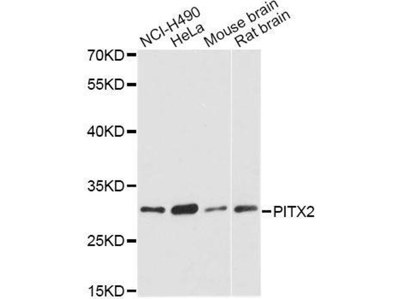 This gene encodes a member of the RIEG/PITX homeobox family, which is in the bicoid class of homeodomain proteins. The encoded protein acts as a transcription factor and regulates procollagen lysyl hydroxylase gene expression. This protein plays a role in the terminal differentiation of somatotroph and lactotroph cell phenotypes, is involved in the development of the eye, tooth and abdominal organs, and acts as a transcriptional regulator involved in basal and hormone-regulated activity of prolactin. Mutations in this gene are associated with Axenfeld-Rieger syndrome, iridogoniodysgenesis syndrome, and sporadic cases of Peters anomaly. A similar protein in other vertebrates is involved in the determination of left-right asymmetry during development. Alternatively spliced transcript variants encoding distinct isoforms have been described.,PITX2,ARP1,ASGD4,Brx1,IDG2,IGDS,IGDS2,IHG2,IRID2,Otlx2,PTX2,RGS,RIEG,RIEG1,RS,Epigenetics & Nuclear Signaling,Transcription Factors,Cell Biology & Developmental Biology,Cardiovascular,Heart,Cardiogenesis,PITX2