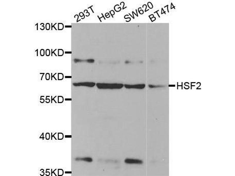 The protein encoded by this gene belongs to the HSF family of transcription factors that bind specifically to the heat-shock promoter element and activate transcription. Heat shock transcription factors activate heat-shock response genes under conditions of heat or other stresses. Alternatively spliced transcript variants encoding different isoforms have been found for this gene.,HSF2,HSF 2,HSTF 2,HSTF2,Epigenetics & Nuclear Signaling,Transcription Factors,HSF2