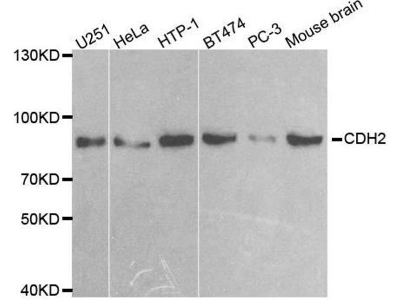 - A synthetic peptide corresponding to a sequence within amino acids 750-850 of human N-Cadherin (NP_001783.2).