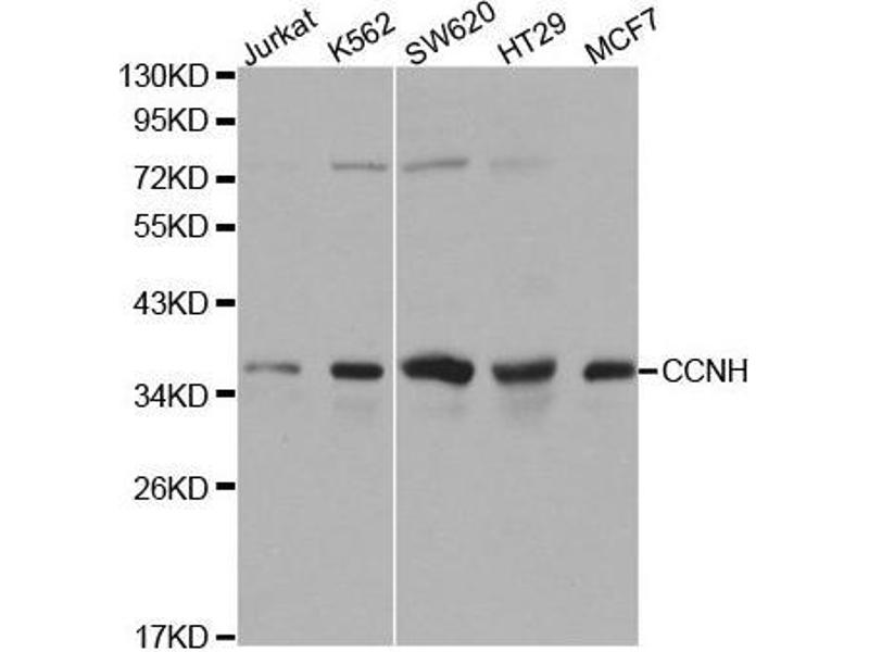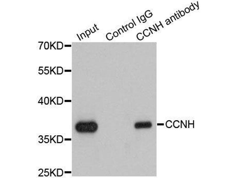 - The protein encoded by this gene belongs to the highly conserved cyclin family, whose members are characterized by a dramatic periodicity in protein abundance through the cell cycle. Cyclins function as regulators of CDK kinases. Different cyclins exhibit distinct expression and degradation patterns which contribute to the temporal coordination of each mitotic event. This cyclin forms a complex with CDK7 kinase and ring finger protein MAT1. The kinase complex is able to phosphorylate CDK2 and CDC2 kinases, thus functions as a CDK-activating kinase (CAK). This cyclin and its kinase partner are components of TFIIH, as well as RNA polymerase II protein complexes. They participate in two different transcriptional regulation processes, suggesting an important link between basal transcription control and the cell cycle machinery. A pseudogene of this gene is found on chromosome 4. Alternate splicing results in multiple transcript variants.,CCNH,CAK,CycH,p34,p37,cyclin-H,Epigenetics & Nuclear Signaling,DNA Damage & Repair,Cell Biology & Developmental Biology,Cell Cycle,Cyclins,CCNH