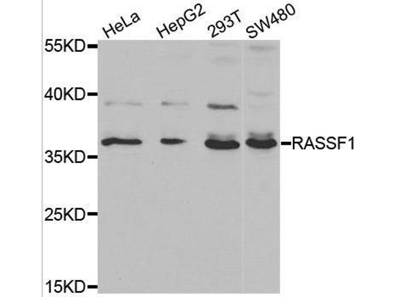 This gene encodes a protein similar to the RAS effector proteins. Loss or altered expression of this gene has been associated with the pathogenesis of a variety of cancers, which suggests the tumor suppressor function of this gene. The inactivation of this gene was found to be correlated with the hypermethylation of its CpG-island promoter region. The encoded protein was found to interact with DNA repair protein XPA. The protein was also shown to inhibit the accumulation of cyclin D1, and thus induce cell cycle arrest. Several alternatively spliced transcript variants of this gene encoding distinct isoforms have been reported.,RASSF1,123F2,NORE2A,RASSF1A,RDA32,REH3P21,Epigenetics & Nuclear Signaling,DNA Damage & Repair,Cancer,Tumor suppressors,Signal Transduction,G protein signaling,Signal Transduction,Cell Biology & Developmental Biology,Apoptosis,Cell Cycle,Cell cycle inhibitors,RASSF1