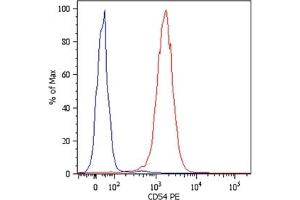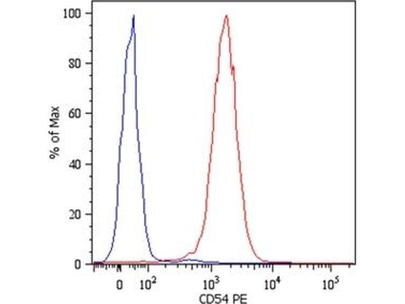 CD54 (ICAM-1) is a 90 kD member of the C2 subset of immunoglobulin superfamily. It is a transmembrane molecule with 7 potential N-glycosylated sites, expressed on resting monocytes and endothelial cells and can be upregulated on many other cells, e.g. with lymphokines, on B- and T-lymphocytes, thymocytes, dendritic cells and also on keratinocytes, chondrocytes, as well as epithelial cells. CD54 mediates cell adhesion by binding to integrins CD11a/CD18 (LFA-1) and to CD11b/CD18 (Mac-1). The interaction of CD54 with LFA-1 enhances antigen-specific T-cell activation.Synonyms: ICAM-1, Intercellular adhesion molecule 1, Major Group Rhinovirus Receptor