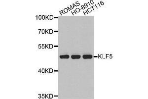 This gene encodes a member of the Kruppel-like factor subfamily of zinc finger proteins. The encoded protein is a transcriptional activator that binds directly to a specific recognition motif in the promoters of target genes. This protein acts downstream of multiple different signaling pathways and is regulated by post-translational modification. It may participate in both promoting and suppressing cell proliferation. Expression of this gene may be changed in a variety of different cancers and in cardiovascular disease. Alternative splicing results in multiple transcript variants.,KLF5,BTEB2,CKLF,IKLF,Epigenetics & Nuclear Signaling,Transcription Factors,Cancer,Tumor suppressors,p53 pathway,Cell Biology & Developmental Biology,Apoptosis,Stem Cells,Mesenchymal Stem Cells,Cardiovascular,Angiogenesis,Heart,Hypertrophy,KLF5
