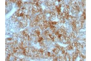 - This mAb recognizes a protein of 130 kDa, identified as Ksp-cadherin. Cadherins form a superfamily of related glycoproteins that mediate calcium-dependent cell adhesion and transmit signals from the extracellular matrix to the cytoplasm. Cadherins have been implicated in embryogenesis, tissue morphogenesis, tissue structure maintenance, cell polarization, neoplastic invasiveness and metastasis, and membrane transport. It is suggested that Ksp-cadherin is a marker for terminal differentiation of the basolateral membranes of renal tubular epithelial cells. Within the kidney, Ksp-Cadherin is found exclusively in the basolateral membrane of renal tubular epithelial cells and collecting duct cells, and not in glomeruli, renal interstitial cells, or blood vessels. Ksp-Cadherin has been suggested to distinguish Chromophobe Renal-Cell Carcinoma from Oncocytoma.
