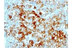 - This mAb recognizes a protein of 130 kDa, identified as Ksp-cadherin. Cadherins form a superfamily of related glycoproteins that mediate calcium-dependent cell adhesion and transmit signals from the extracellular matrix to the cytoplasm. Cadherins have been implicated in embryogenesis, tissue morphogenesis, tissue structure maintenance, cell polarization, neoplastic invasiveness and metastasis, and membrane transport. It is suggested that Ksp-cadherin is a marker for terminal differentiation of the basolateral membranes of renal tubular epithelial cells. Within the kidney, Ksp-Cadherin is found exclusively in the basolateral membrane of renal tubular epithelial cells and collecting duct cells, and not in glomeruli, renal interstitial cells, or blood vessels. Ksp-Cadherin has been suggested to distinguish Chromophobe Renal-Cell Carcinoma from Oncocytoma.
