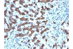 This mAb recognizes a protein of 165  kDa, identified as carbamoyl phosphate synthetase 1 (CPS1). This mitochondrial enzyme catalyzes synthesis of carbamoyl phosphate from ammonia and bicarbonate. This reaction is the first committed step of the urea cycle, which is important in the removal of excess urea from cells. Deficiency of CPS1 is an autosomal recessive disorder that causes hyperammonemia. CPS1 is a hepatocyte specific protein that localizes to the mitochondria of hepatocytes. It is a sensitive marker for distinguishing hepatocellular carcinomas (HCC) from other metastatic carcinomas as well as cholangio-carcinomas. HCC s occur primarily in the stomach, but they are also found in many other organs. CPS1 may also be a useful marker for intestinal metaplasia. Reportedly, strong expression of CPS1 correlates with smaller tumor size and longer patient survival. Occasionally, CPS1 is also found in gastric carcinomas as well as in a few other non-hepatic tumors.