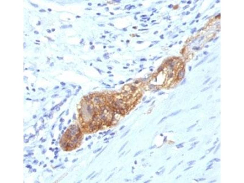 1. Staining of formalin-fixed tissues requires boiling tissue sections in 10 mM Citrate Buffer, pH 6.0, for 10-20 min followed by cooling at RT for 20 minutes.