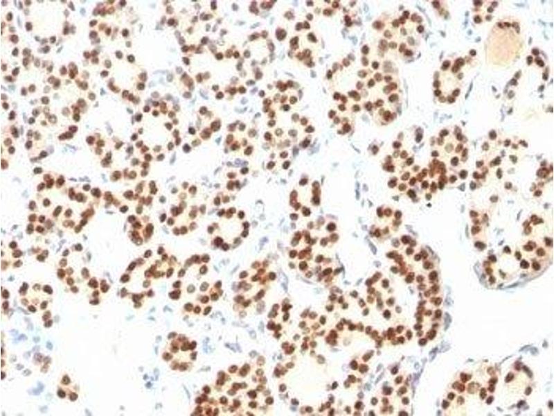 - Recognizes a protein of 40 kDa, identified as Thyroid transcription factor-1 (TTF-1). TTF-1 is a member of the NKx2 family of homeodomain transcription factors. It is expressed in epithelial cells of the thyroid gland and the lung. Nuclei from liver, stomach, pancreas, small intestine, colon, kidney, breast, skin, testes, pituitary, prostate, and adrenal glands are unreactive. Anti-TTF-1 is useful in differentiating primary adenocarcinoma of the lung from metastatic carcinomas originating in the breast, mediastinal germ cell tumors, and malignant mesothelioma. It can also be used to differentiate small cell lung carcinoma from lymphoid infiltrates. Loss of TTF-1 expression in non-small cell lung carcinoma has been associated with aggressive behavior of such neoplasms. TTF-1 reactivity is also seen in thyroid malignancies.