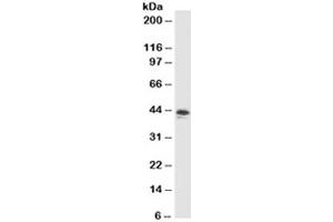 2. The prediluted format is supplied in a dropper bottle and is optimized for use in IHC. After epitope retrieval step (if required), drip mAb solution onto the tissue section and incubate at RT for 30 min.\. Western blot: 1-2 μg/mL, Flow Cytometry: 0.5-1 μg/million cells in 0.1ml,Immunofluorescence: 1-2 μg/mL,Immunohistochemistry (FFPE): 0.5-1 μg/mL for 30 min at RT (1),Prediluted format : incubate for 30 min at RT (2) -