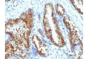 - Recognizes a single protein of 33-34 kDa, identified as the prostate specific antigen (PSA). This mAb is highly specific to PSA and stains prostatic secretory and ductal epithelium in both normal and neoplastic tissues. PSA is a chymotrypsin-like serine protease (kallikrein family) exclusively produced by the prostate epithelium, and abundant in seminal fluid. PSA can be detected in the sera of patients with prostatic carcinoma. It is predominantly complexed to a liver-derived serine protease inhibitor, alpha-1-antichymotrypsin (ACT). A higher proportion of serum PSA is complexed to ACT in prostate cancer than in benign prostate hyperplasia.