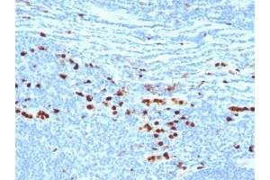 - Recognizes S100A8/MPR8 and S100A9/MRP14, an intra-cytoplasmic antigen comprising of a 12 kDa alpha chain and a 14 kDa beta chain expressed by granulocytes, monocytes and by tissue macrophages. Macrophages usually arise from hematopoietic stem cells in the bone marrow. Under migration into tissues, the monocytes undergo further differentiation to become multifunctional tissue macrophages. They are classified into normal and inflammatory macrophages. Normal macrophages include macrophages in connective tissue (histiocytes), liver (Kupffer's cells), lung (alveolar macrophages), lymph nodes (free and fixed macrophages), spleen (free and fixed macrophages), bone marrow (fixed macrophages), serous fluids (pleural and peritoneal macrophages), skin (histiocytes, Langerhans's cell) and in other tissues. Inflammatory macrophages are present in various exudates. Macrophages are part of the innate immune system, recognizing, engulfing and destroying many potential pathogens including bacteria, pathogenic protozoa, fungi and helminthes. This mAb reacts with neutrophils, monocytes, macrophages, and squamous mucosal epithelia and has been shown as an important marker for identifying macrophages in tissue sections.