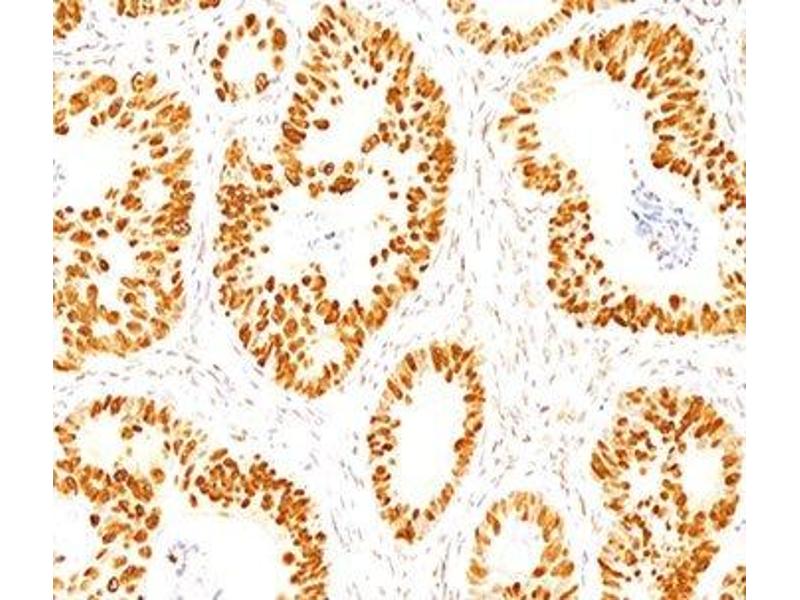 1. Staining of formalin-fixed tissues requires boiling tissue sections in 10 mM citrate buffer, pH 6.0, for 10-20 min followed by cooling at RT for 20 minutes.