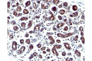 - This antibody recognizes a polypeptide of ~6.5 kDa, identified as Estrogen Inducible Protein pS2. The antibody's epitope is localized between amino acids 57-84. pS2 is a trefoil peptide. Trefoil peptides are protease resistant molecules secreted throughout the gut that play a role in mucosal healing. These peptides contain three intrachain disulfide bonds, forming the trefoil motif, or P-domain. Estrogen Inducible Protein pS2 is known to form dimers and this dimerization is thought to play a role in its protective and healing properties. About 60 % of breast carcinomas are positive for estrogen inducible protein pS2. Staining is cytoplasmic, often with localization to the Golgi apparatus. It is shown to be localized in normal stomach mucosa, gastric fluid, goblet cells in the colon and small intestine, and in ulcerations of the gastrointestinal tract. Several studies have shown that estrogen inducible protein pS2 is primarily expressed in estrogen receptor-positive breast tumors and it may define a subset of estrogen-dependent tumors that displays an increased likelihood of response to endocrine therapy.