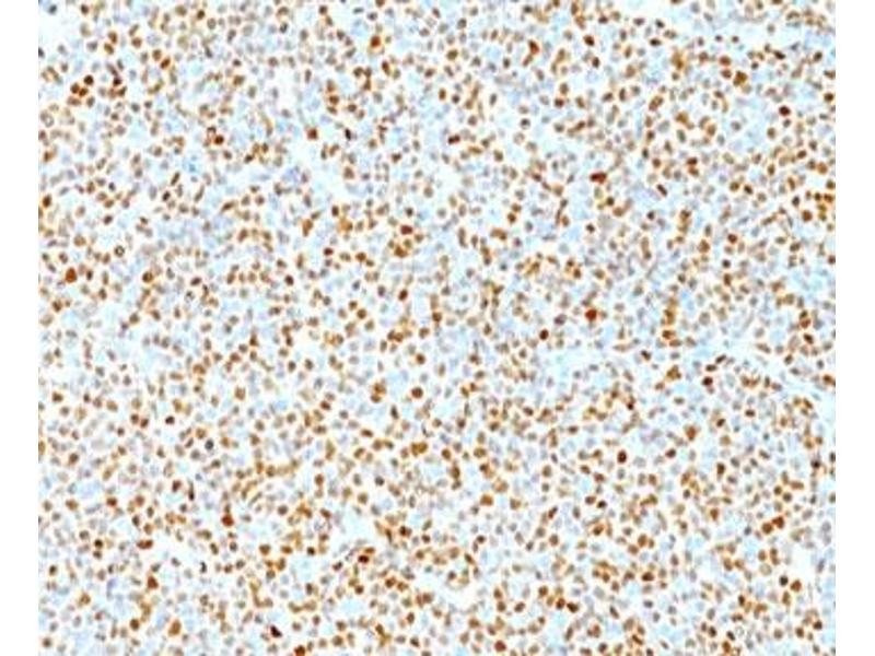 - This antibody recognizes a protein of 36 kDa, identified as Cyclin D1. It is a putative proto-oncogene overexpressed in a wide variety of human neoplasms and a key cell cycle regulator. This antibody neutralizes the activity of Cyclin D1 in vivo. About 60 % of mantle cell lymphomas (MCL) contain a t(11, 14)(q13, q32) translocation resulting in over-expression. Cyclin D1 antibody is useful in identifying mantle cell lymphomas, which stain positive, from CLL/SLL and follicular lymphomas, which stain negative. Occasionally, hairy cell leukemia and plasma cell myeloma weakly express Cyclin D1.