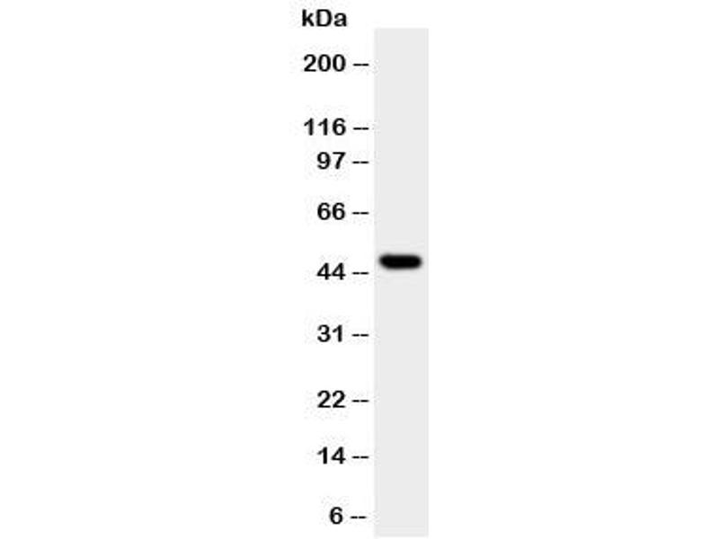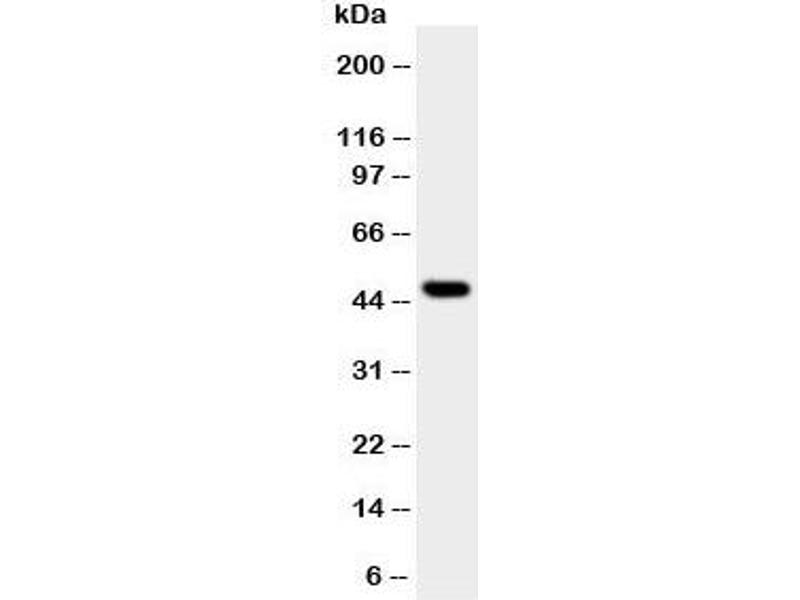 An amino acid sequence from the N-terminus of human JNK1 (MSRSKRDNNFYSVEI) was used as the immunogen for this JNK1 antibody (100% homologous in human, mouse and rat).