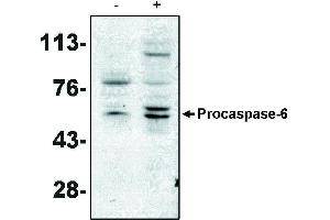 Cysteine-requiring Aspartate Protease-6, Apoptotic protease Mch-2,Caspase-6 (Cysteine-Requiring Aspartate Proteases) is part of a family of intracellular cysteine proteases that cleave their substrates after aspartic acid residues. These proteases play an integral role in inducing apoptosis in cells. Procaspase-6 (Mch2), a member of the ICE/ced-3 subfamily, is an inactive proenzyme that is activated to form caspase-6 by proteolytic cleavage at certain aspartic acid residues. During cleavage, the N-terminal is removed and the proenzyme is converted into a large (p18) and small (p11) subunits. Caspase-6 has two isoforms, and , produced by alternative splicing. Over-expression of the isoform of caspase-6 without its prodomain can induce apoptosis. The isoform does not seem to display proteolytic activity. Together with caspases-3 and -7, the isoform of caspase-6 is classified as an effector/execution caspase. Caspase-3, caspase-8 and caspase-10 can cleave procaspase-6. Active caspase-6 cleaves several other proteins such as lamins, NuMa and Keratin 18. A possible cleavage of caspases-8 and -10 in cytochrome-C dependent apoptosis was reported recently.