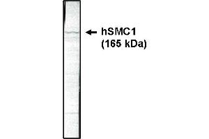 Structural Maintenance of Chromosomes (SMC) family proteins play critical roles in various nuclear events that require structural changes of chromosomes, including mitotic chromosome organization, DNA recombination and repair and global transcriptional repression. The chromosome proteins are conserved in eukaryotes lead to mitotic chromosome segregation defects, suggesting a critical function of SMC family proteins in mitotic chromosome dynamics. SMC1 and SMC3 form a heterodimeric complex required for metaphase progression in mitotic cells. Specifically this SMC1/SMC3 complex is responsible for sister chromatid cohesion during metaphase. A number of cellular factors interact with hSMC1/hSMC3 during cell cycle. The major population of hSMC1/hSMC3 is in a compex with hRAD21 forming the human cohesion complex. Human cohesion associates with chromosomes which peaks at S phase and dissociates from chromosomes during G2/M transition. In addition, a subpopulation of hSMC1/hSMC3 associates tightly with nuclear matrix and centrosomes during interphase. A subset of hSMC1/hSMC3 is localized to spindle poles, spindles and kinetochores during mitosis when cohesin is in the cytoplasm. hSMC1/hSMC3 is required for spindle aster formation in vitro and reacts with nuclear mitotic apparatus (2) protein in vivo.