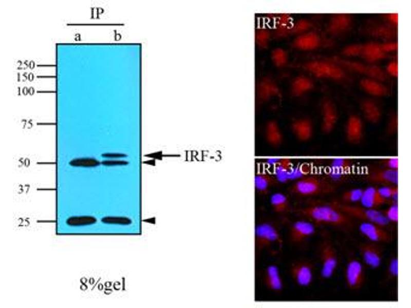 Members of the Interferon regulatory factor (IRF) family regulate gene expression critical to immune response, hemopoiesis, and proliferation. IRF-3 is distinct from other family members. Its transcriptional activity is regulated solely by posttranslational modifications. It plays a crucial role in activation of innate immunity and inflammation in response to viral infection. IRF3 accumulates in an inactive form in the cytoplasm and then translocates to the nucleus as a homodimer, following stimuli-induced phosphorylation of specific serine/threonine residues. Association of the homodimer with p300/CBP (CREBB binding protein) forms dsRNA-activated factor 1 (DRAF1), which then activates the transcription of interferon alpha and beta, along with other interferon-induced genes.Synonyms: IRF-3, Interferon regulatory factor 3