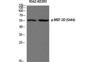 - Phospho-MEF-2D (S444) Polyclonal Antibody detects endogenous levels of MEF-2D protein only when phosphorylated at S444.