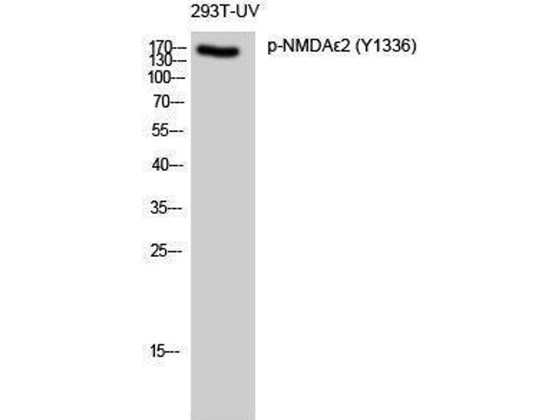Phospho-NMDAε2 (Y1336) Polyclonal Antibody detects endogenous levels of NMDAε2 protein only when phosphorylated at Y1336.