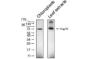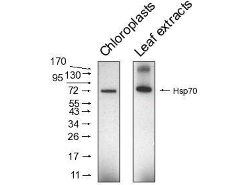 - KLH-conjugated synthetic peptide derived from higher plant chloroplastic HSP70, inluding Arabidopsis thaliana cpHSC70-1, At4g24280 and cpHSC70-2, At4g49910