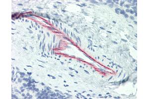 Usage: Immunohistochemistry: This antibody was validated for use in immunohistochemistry on a panel of 21 formalin-fixed, paraffin-embedded (FFPE) human tissues after heat induced antigen retrieval in pH 6.0 citrate buffer. After incubation with the primary antibody, slides were incubated with biotinylated secondary antibody, followed by alkaline phosphatase-streptavidin and chromogen. The stained slides were evaluated by a pathologist to confirm staining specificity. The optimal working concentration for this antibody was determined to be 5 μg/mL. -