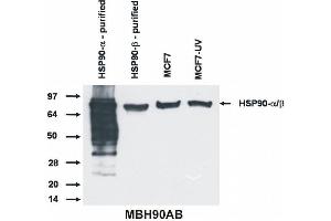 - The antibody MBH90AB recognizes the epitope EEEVE within N-terminal part of ubiquitously expressed Hsp90 alpha and Hsp90 beta intracellular proteins with calculated Mw of 84.7 kDa and 83.3 kDa, respectively, however, migrating as 90 kDa bands under reducing SDS-PAGE conditions.