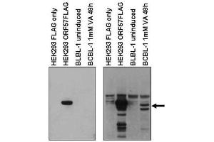 Application Note: This affinity purified antibody has been tested for use in ELISA and western blotting. Specific conditions for reactivity should be optimized by the end user. Expect a band 50-55 kDa in size corresponding to KSHV ORF57 protein by western blotting in the appropriate cell lysate or extract.