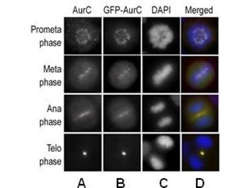 - Chromosomal segregation during mitosis as well as meiosis is regulated by kinases and phosphatases. The Aurora kinases, members of the Ser/Thr protein kinase family, associate with microtubules during chromosome movement and segregation. Aurora kinase C may play a part in organizing microtubules in relation to the function of the centrosome/spindle pole during mitosis. This protein is localized to centrosome from anaphase to cytokinesis. Expression is limited to testis in normal cells. Elevated expression levels are seen only in a subset of cancer cells such as HepG2, HuH7 and HeLa cells. Aurora-C expression is maximum at M phase.Synonyms: AIE2, AIK3, AURKC, Aurora-C, Aurora/Ipl1-related kinase 3, Aurora/Ipl1/Eg2 protein 2, STK13, Serine/threonine-protein kinase 13