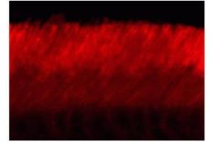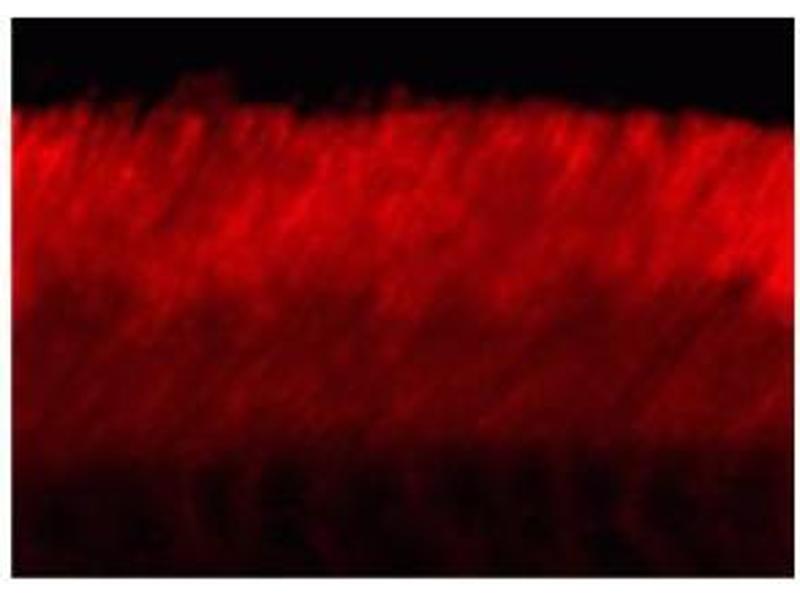 ABCA4 (ATP-binding cassette, sub-family A (ABC1), member 4, Rim Protein) is a member of the superfamily of ATP-binding cassette (ABC) transporters (Illing et al., 1997). ABC proteins transport various molecules across extra- and intracellular membranes. This protein is a retina-specific ABC transporter with N-retinylidene-PE as a substrate. It is expressed exclusively in retina photoreceptor cells, indicating the gene product mediates transport of an essential molecule across the photoreceptor cell membrane. Mutations in this gene are found in patients diagnosed with Stargardt disease and are associated with retinitis pigmentosa-19 and age-related macular degeneration (Wiszniewski et al., 2003). Defects in ABCA4 are the cause of Stargardt disease type 1 (STGD1) (Molday et al., 2000). STGD is one of the most frequent causes of macular degeneration in childhood. Defects in ABCA4 are also known to cause fundus flavimaculatus (FFM), age-related macular degeneration type 2 (ARMD2) and cone-rod dystrophy type 3 (CORD3) (Klevering et al., 2005). Anti-ABCA4 Immunohistochemical staining of adult mouse retina showing specific immunolabeling of the ABCA4 protein. Photo courtesy of Mary Raven, University of California, Santa Barbara, CA.