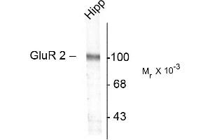 The ion channels activated by glutamate are typically divided into two classes. Those that are sensitive to N-methyl-D-aspartate (NMDA) are designated NMDA receptors (NMDAR) while those activated by (-amino-3-hydroxy-5-methyl-4-isoxalone propionic acid (AMPA) are known as AMPA receptors (AMPAR). The AMPAR are comprised of four distinct glutamate receptor subunits designated (GluR1-4) and they play key roles in virtually all excitatory neurotransmission in the brain (Keinänen et al., 1990,Hollmann and Heinemann, 1994). The GluR2 subunit is thought to play a key role in forms of synaptic plasticity such as LTD (Chung et al., 2003) Anti-GluR2 Western blot of a rat hippocampal (Hipp) lysate showing the specific immunolabeling of the ~100k GluR2 protein.