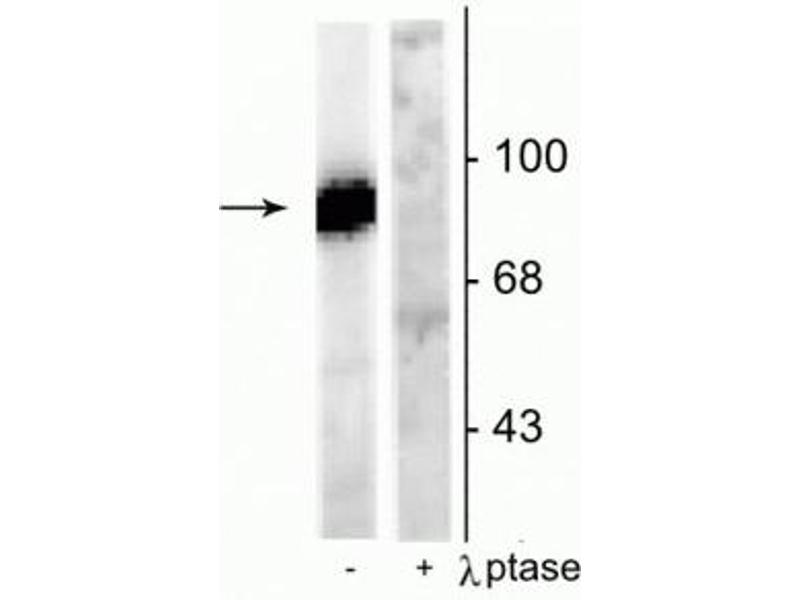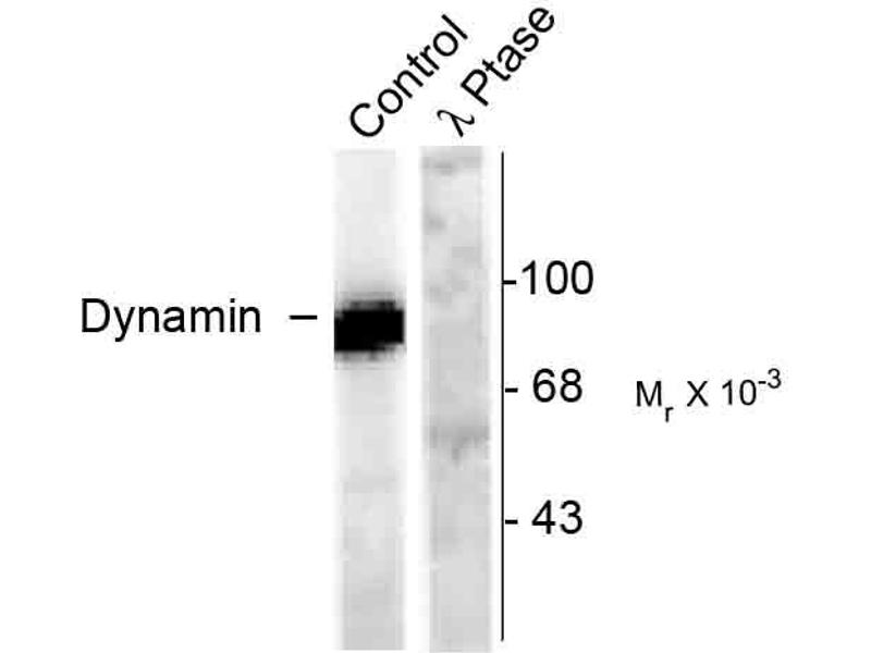- Specific for endogenous levels of the ~95 kDa dynamin protein phosphorylated at Ser778. Labels the purified protein phosphorylated in vitro by cdk5 but not by PKC. Does not cross react with other purified substrates of cdk5 (e.g. amphiphysin and synapsin). Immunolabeling is completely eliminated by treatment with λ-phosphatase.