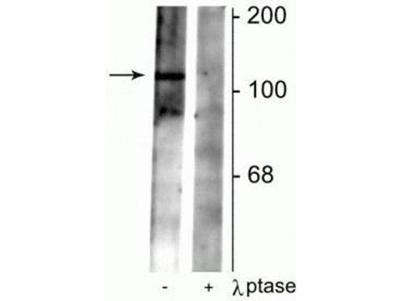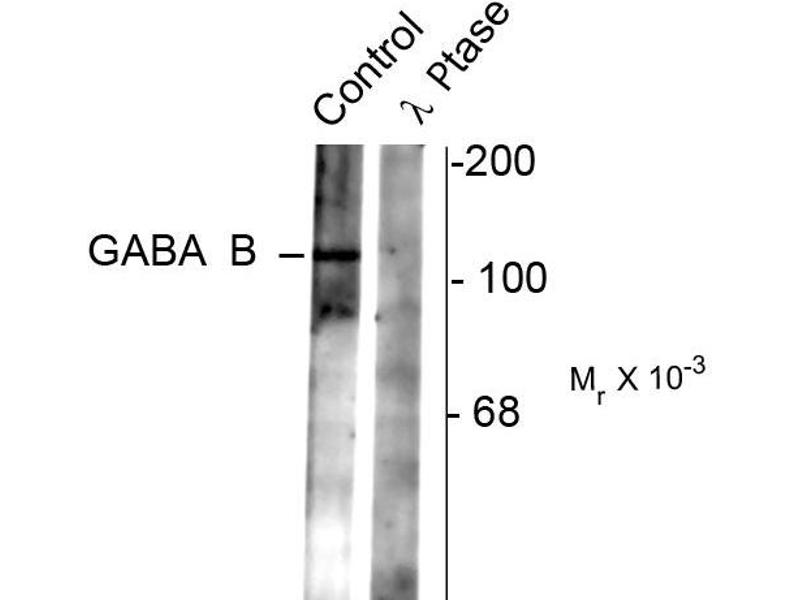 - Specific for endogenous levels of the ~102 kDa GABAB R2 phosphorylated at Ser783. Immunolabeling is completely eliminated by treatment with λ-phosphatase.