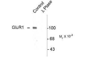- Specific for endogenous levels of the ~100 kDa GluR1 protein phosphorylated at Ser845. Immunolabeling is completely eliminated by treatment with λ-phosphatase.