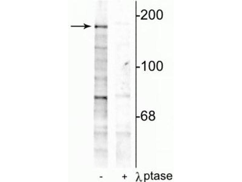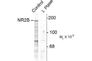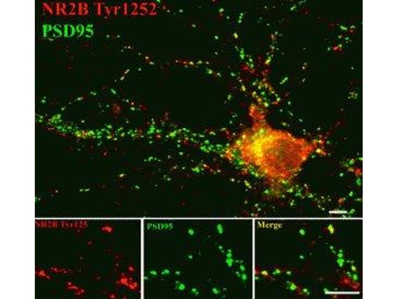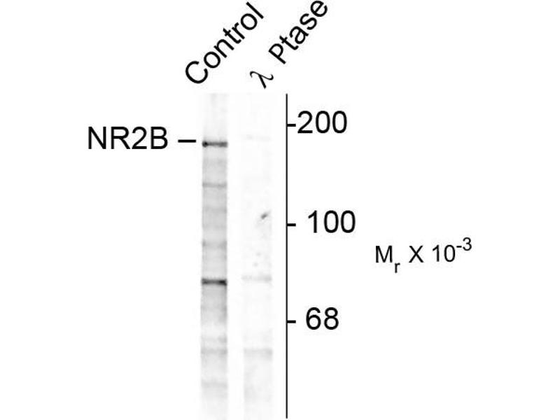 - Specific for endogenous levels of the ~180 kDa NMDAR NR2B-subunit protein phosphorylated at Tyr1252 . Immunolabeling is completely eliminated by treatment with λ-phosphatase. May also show slight reactivity with Tyr1246 of NR2A.