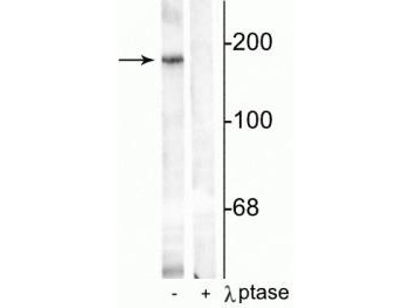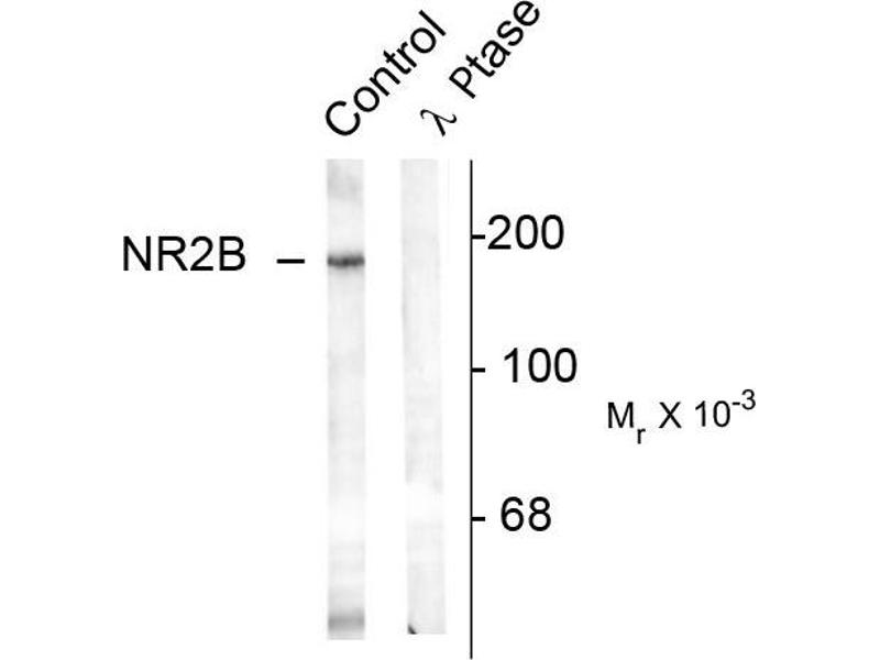 - Specific for endogenous levels of the ~180 kDa NMDAR NR2B-subunit protein phosphorylated at Tyr1336 . Immunolabeling is completely eliminated by treatment with λ-phosphatase.