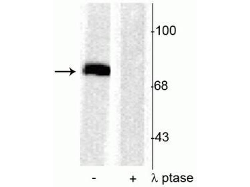 - Specific for endogenous levels of the ~78 kDa synapsin I doublet phosphorylated at Ser603 . Immunolabeling is completely eliminated by treatment with λ-phosphatase.