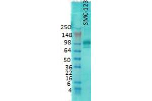 - Detects ~100 kDa. An additional protein of >100 kDa is also detected. Additional cross-reactive bands are detected at ~75 kDa and 50 kDa in rat and mouse samples.
