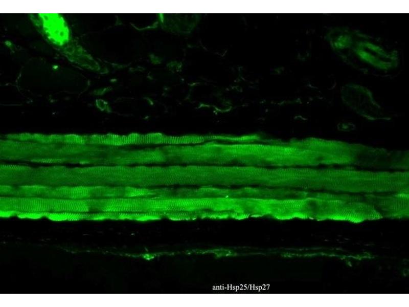 - HSP25 is the mouse homologue of the human HSP27 protein, a member of the small heat shock protein family comprised of a diverse group of proteins from ~15 to >30 kDa(1). The basic structure of most sHSPs is a homologous and highly conserved amino acid sequence, with an α-crystallin-domain at the C-terminus and the WD/EPF domain at the less conserved N-terminus. This N-terminus is essential for the development of high molecular oligomers (2, 3). HSP27-oligomers consist of stable dimers formed by as many as 8-40 HSP27 protein monomers (4). The oligomerization status is connected with the chaperone activity: aggregates of large oligomers have high chaperone activity, whereas dimers have no chaperone activity (5). HSP27 is localized to the cytoplasm of unstressed cells but can redistribute to the nucleus in response to stress, where it may function to stabilize DNA and/or the nuclear membrane. It can be rapidly phosphorylated in response to physiological stimuli relevant to the cell type examined. Thus, HSP27 has been suggested to be an important intermediate in second messenger-mediated signaling pathways (6). Other functions include chaperone activity (as mentioned above), thermo-tolerance in vivo, inhibition of apoptosis, and signal transduction. Specifically, in vitro, it acts as an ATP-independent chaperone by inhibiting protein aggregation and by stabilizing partially denatured proteins, which ensures refolding of the HSP70 complex. HSP27 is also involved in the apoptotic signaling pathway because it interferes with the activation of cytochrome c/Apaf-1/dATP complex, thereby inhibiting the activation of procaspase-9. It is also hypothesized that HSP27 may serve some role in cross-bridge formation between actin and myosin (7). And finally, HSP27 is also thought to be involved in the process of cell differentiation. The up-regulation of HSP27 correlates with the rate of phosphorylation and with an increase of large oligomers. It is possible that HSP27 may play a crucial role in termination of growth (8). For more information visit our HSP27 Scientific Resource Guide at http://www.HSP27.com.