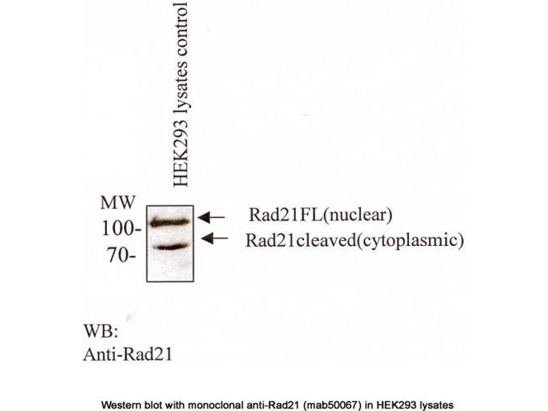 - Reacts with nuclear and cleaved cytoplasmic human RAD21 protein