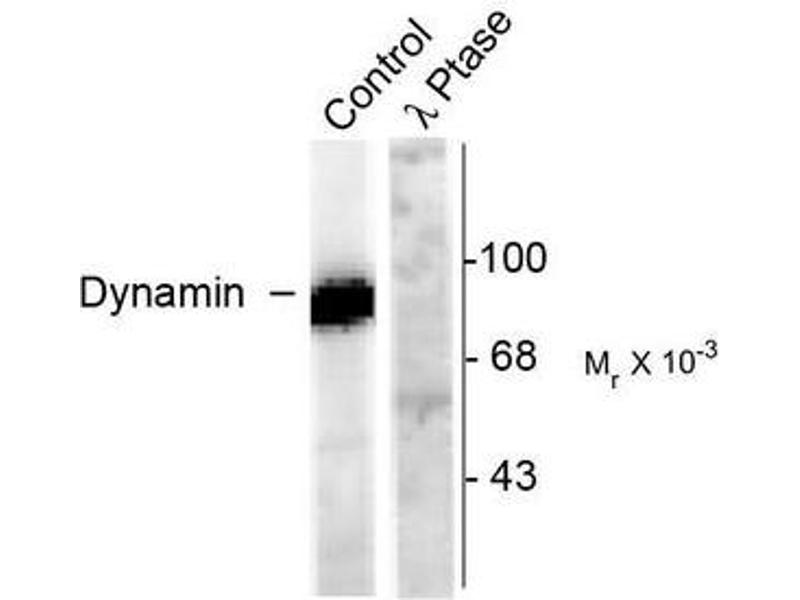 - Specific for the ~95k dynamin protein phosphorylated at Ser778. This antibody labels the purified protein phosphorylated in vitro by CDK5 but not by PKC. Does not cross react with other purified substrates of CDK5 (e.g. Amphiphysin and Synapsin). Immunolabeling is blocked by lambda-phosphatase treatment.