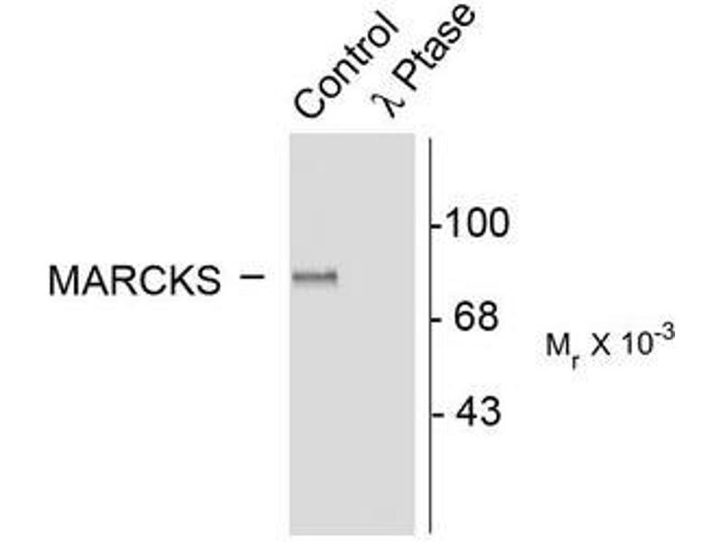 Myristoylated Alanine-Rich C Kinase Substrate (MARCKS) is a major substrate for phosphorylation by protein kinase C (PKC) (Ouimet et al., 1990). The phosphorylation of Ser152/156 can be used as a measure of PKC activation although these sites are also phosphorylated by PRK1 (Palmer et al., 1996) MARCKS is a member of a family of calmodulin binding proteins and phosphorylation of Ser152/156 modulates the binding of MARCKS to calmodulin (Verghese et al., 1994).Synonyms: MACS, Myristoylated alanine-rich C-kinase substrate, PRKCSL