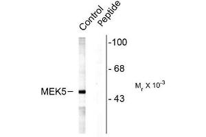 This antibody is specific for the ~49k MEK5 protein phosphorylated at Ser311, Thr315. Immunolabeling of the MEK5 band is blocked by preadsorption with the phospho-peptide used as antigen but not be the corresponding dephospho-peptide.
